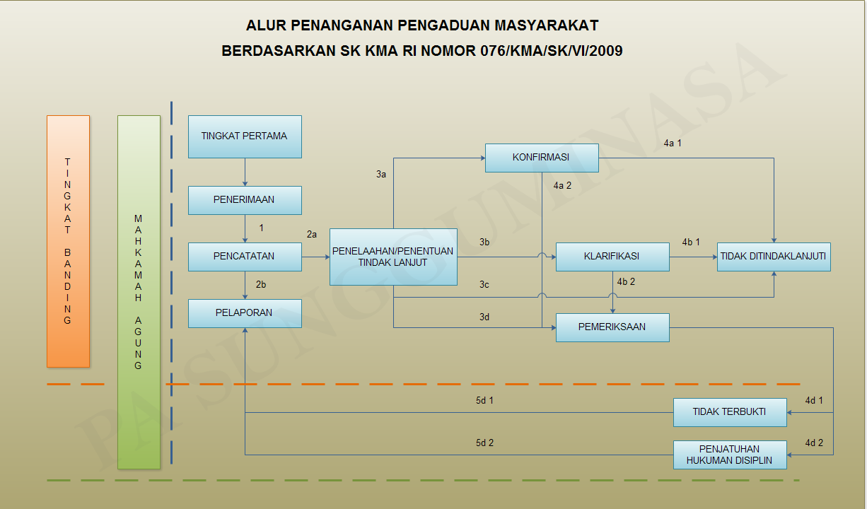 Gambar di atas merupakan Skema Alur Penanganan Pengaduan Masyarakat berdasarkan Surat Keputusan Ketua Mahkamah Agung No. 076/KMA/SK/VI/2009. Berdasarkan SK KMA Nomor 076/KMA/SK/VI/2009 tersebut Pengadilan Tingkat Banding sebagai voorpost Mahkamah Agung RI diberi kewenangan menangani sendiri pengaduan masyarakat yang masuk, kecuali dalam beberapa hal Badan Pengawasan Mahkamah Agung RI dapat mengambil alih apabila :