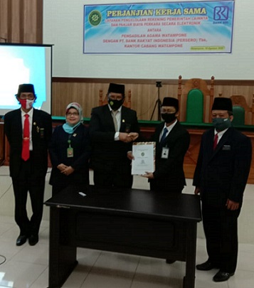 Watampone, Rabu, 19 Agustus 2020, bertempat di ruang pertemuan Pengadilan Agama Watampone Kelas 1A telah dilaksanakan pertemuan dan penandatanganan Memorandum of Understanding (MoU) antara Pengadilan Agama Watampone kelas IA dengan pihak BRI (Bank Rakyat Indonesia) Cabang Watampone tentang Layanan Pengelolaan Rekening Pemerintah Lainnya dan Panjar Biaya Perkara Secara Elektronik.