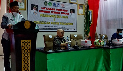 Dalam sambutannya, Beliau mengucapkan terimakasih atas terselenggaranya kegiatan ini, khususnya Pengadilan Agama Watampone, yang turun langsung ke daerah dan melaksanakan kegiatan tersebut. Sidang Isbat yang dilaksanakan ini dinilai sangat membantu masyarakat yang sudah menikah tetapi belum memiliki Buku Nikah dan Akte Kelahiran anak, sehingga kepemilikan status hukum perkawinan dan kependudukan bagi masyarakat kabupaten Bone akan tercatat dalam dokumen negara. Dengan adanya layanan Sidang Terpadu, masyarakat tidak perlu datang ke Pengadilan Agama sehingga dapat menghemat biaya dan waktu masyarakat.