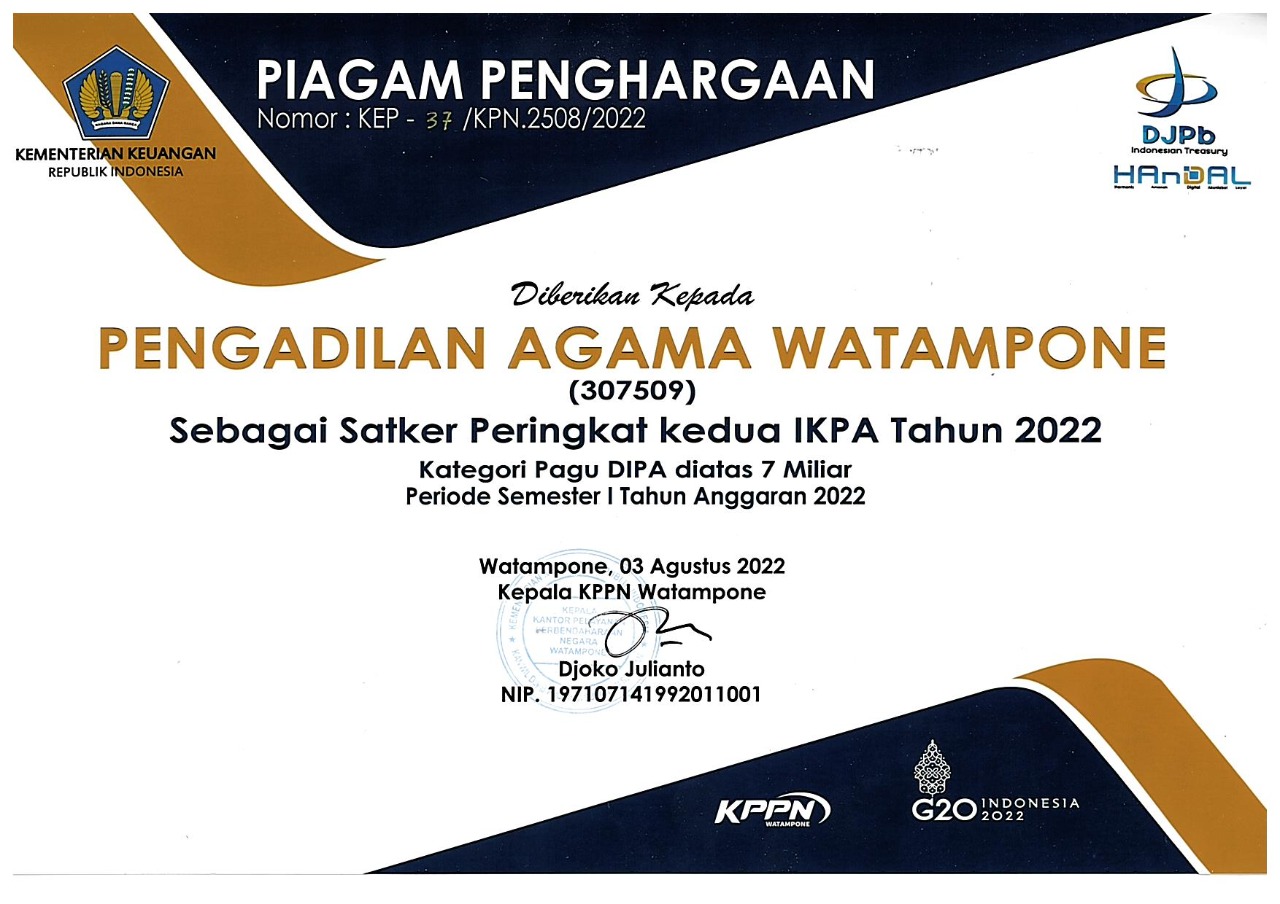 Watampone, 4 Agustus 2022 - Pengadilan Agama Watampone meraih penghargaan sebagai satker peringkat kedua IKPA Tahun 2022 kategori pagu DIPA di atas 7 miliar dari Kantor Pelayanan Perbendaharaan Negara (KPPN) Watampone, Direktorat Jenderal Perbendaharaan Negara, Kementerian Keuangan.